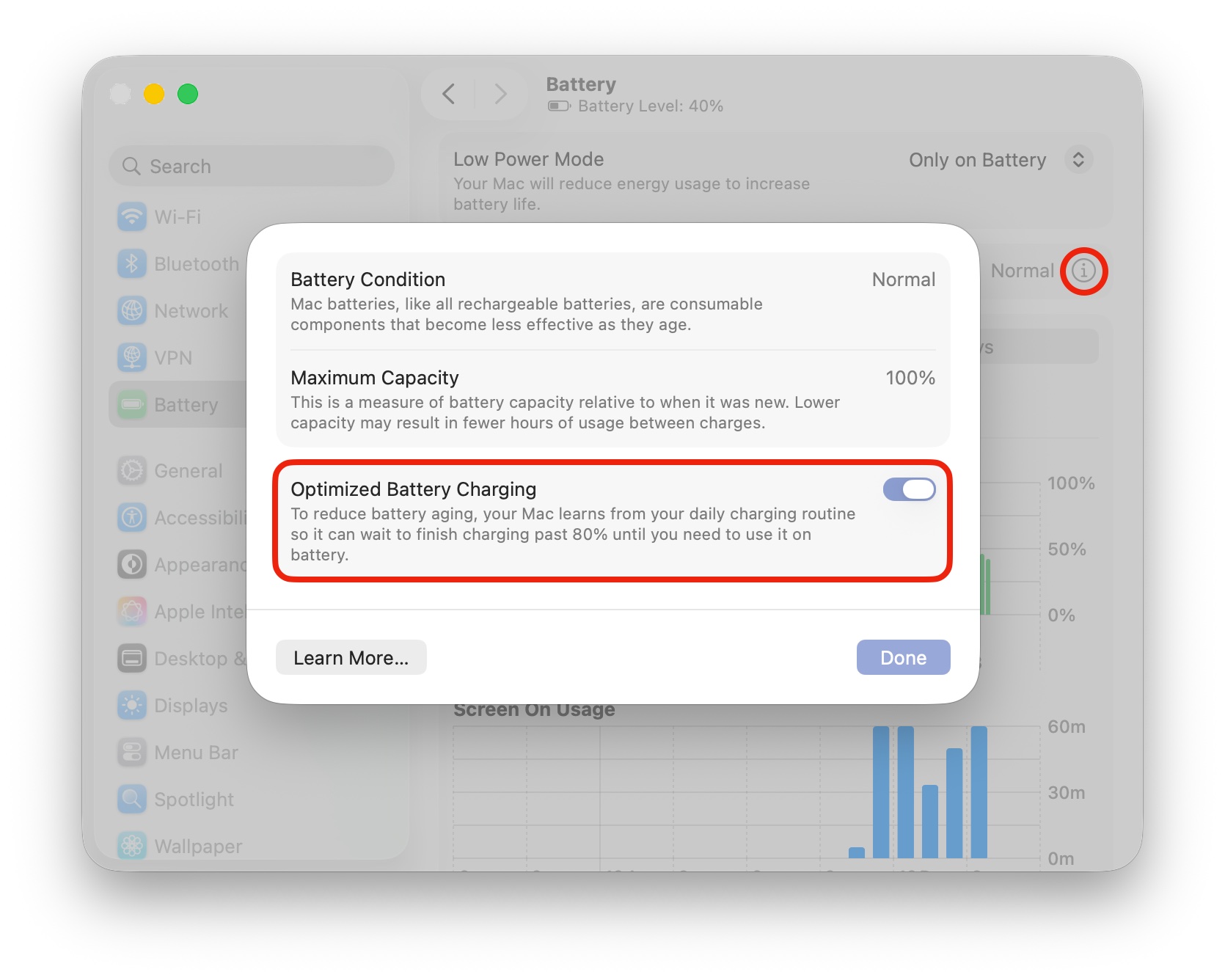 Make sure you’re taking advantage of optimized battery charging. Go to System Settings > Battery. Next to “Battery Health,” click the info button (ⓘ). Make sure Optimized Battery Charging is enabled.