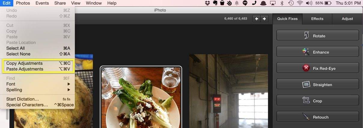 While in Edit mode, go to the Edit menu and select Copy Adjustments in the photo you want to source the tweaks from. Then select the photo you want to apply the adjustments to and select Paste Adjustments. There’s even a keyboard shortcut for each menu item to make pasting to multiple photos a breeze — just hit Option-Command-C to copy and Option-Command-V to paste. Slick!