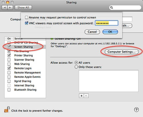Starting with Mac OS X 10.4 VNC has been included in the built-in Remote Desktop software; go to System Preferences –> Sharing –> Screen Sharing, click the Computer Settings… button and select VNC viewers may control screen with password: Be sure to use a strong password.