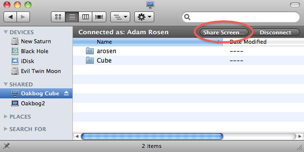 The remote system will show up in either your Buddy List, double-click to initiate a chat session. Once connected go to Buddies –> Ask to Share to connect to the remote screen. Apple uses it’s graphics wizardry to show both the local and remote screens simultaneously; click on the smaller window in the bottom right corner to switch between local and remote screens. This happens simultaneously to any text, audio or video chats you may have going (bandwidth permitting). Slick.
