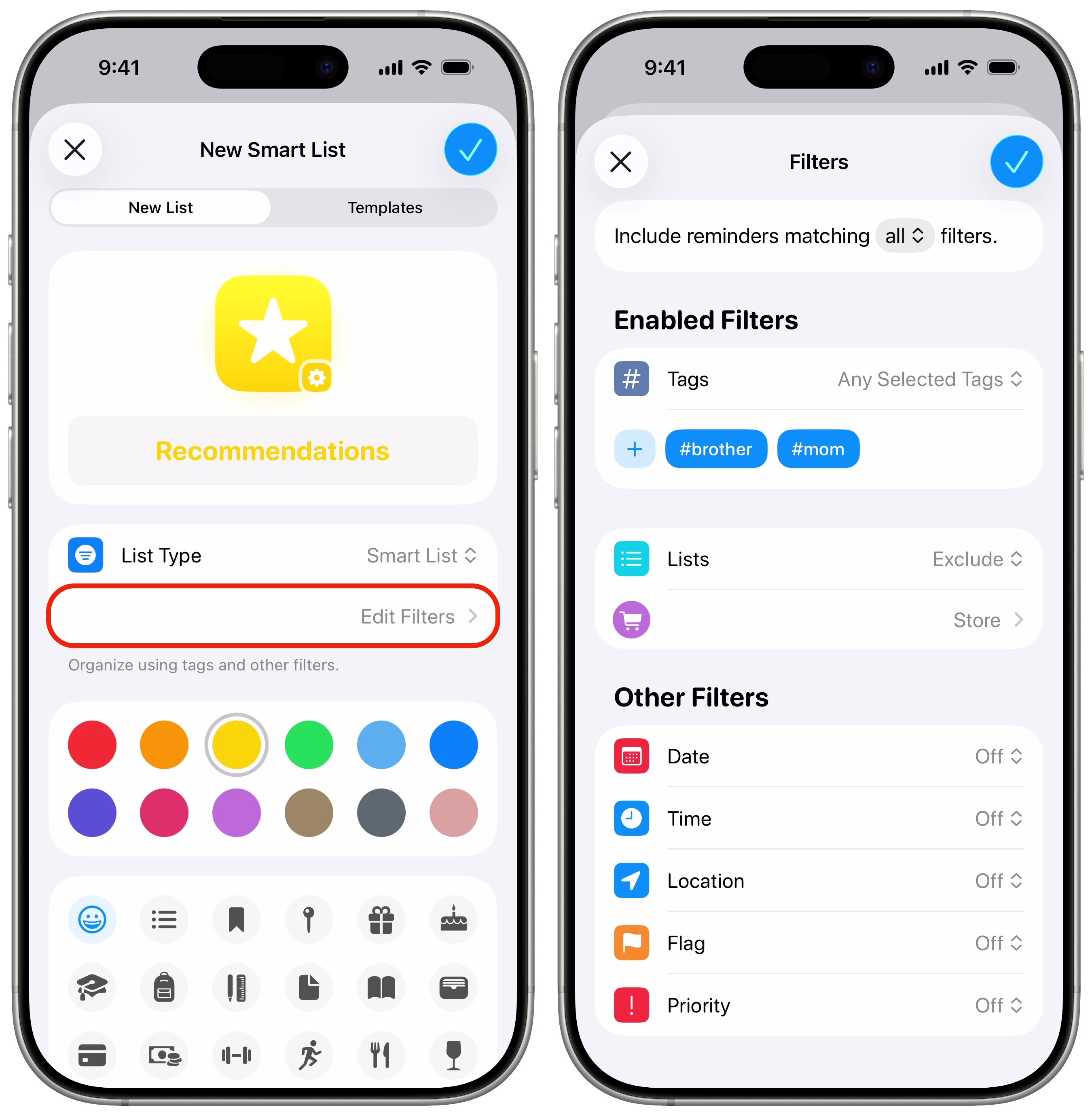 Then, you tap Edit Filters to set it up. Here, I’m making a smart list for recommendations: I want to see everything in my Books, Movies and Games lists that my friends recommended to me, but I don’t want anything from my shopping list to show up here. So I have Tags set to Any Selected Tags, and I set “Lists” to Exclude Store. Tap Done when you’ve picked your filters — and don’t forget to give the list a name, color and icon!