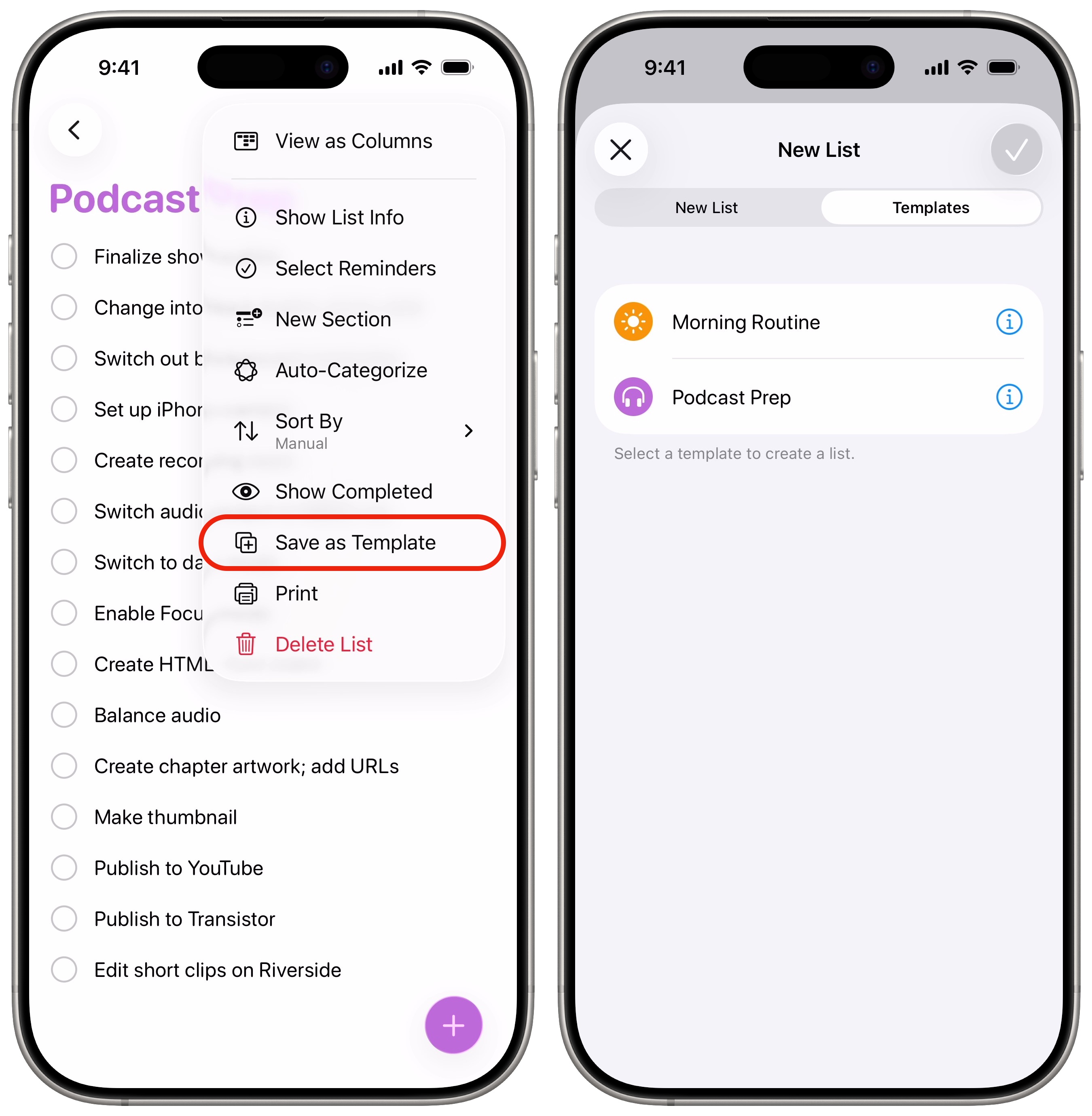 Start by creating a Reminders list. Add List, customize the name, color and icon, tap Done. Fill it in with your to-do list. Finally, tap the ⋯ button, tap Save as Template and tap Save.