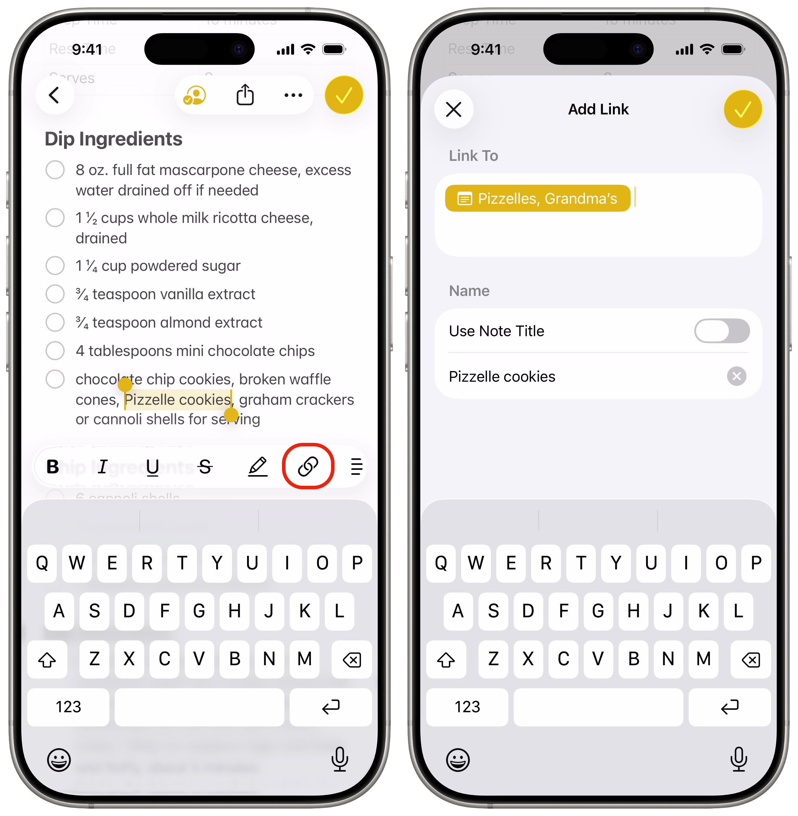 You can link to a note from within another note to tie some related topics together. For example, if you have a recipe that includes food made from a different recipe, you can add a link for convenience. Or, if you’re taking notes in school, you can link to a concept or topic covered previously, for context.