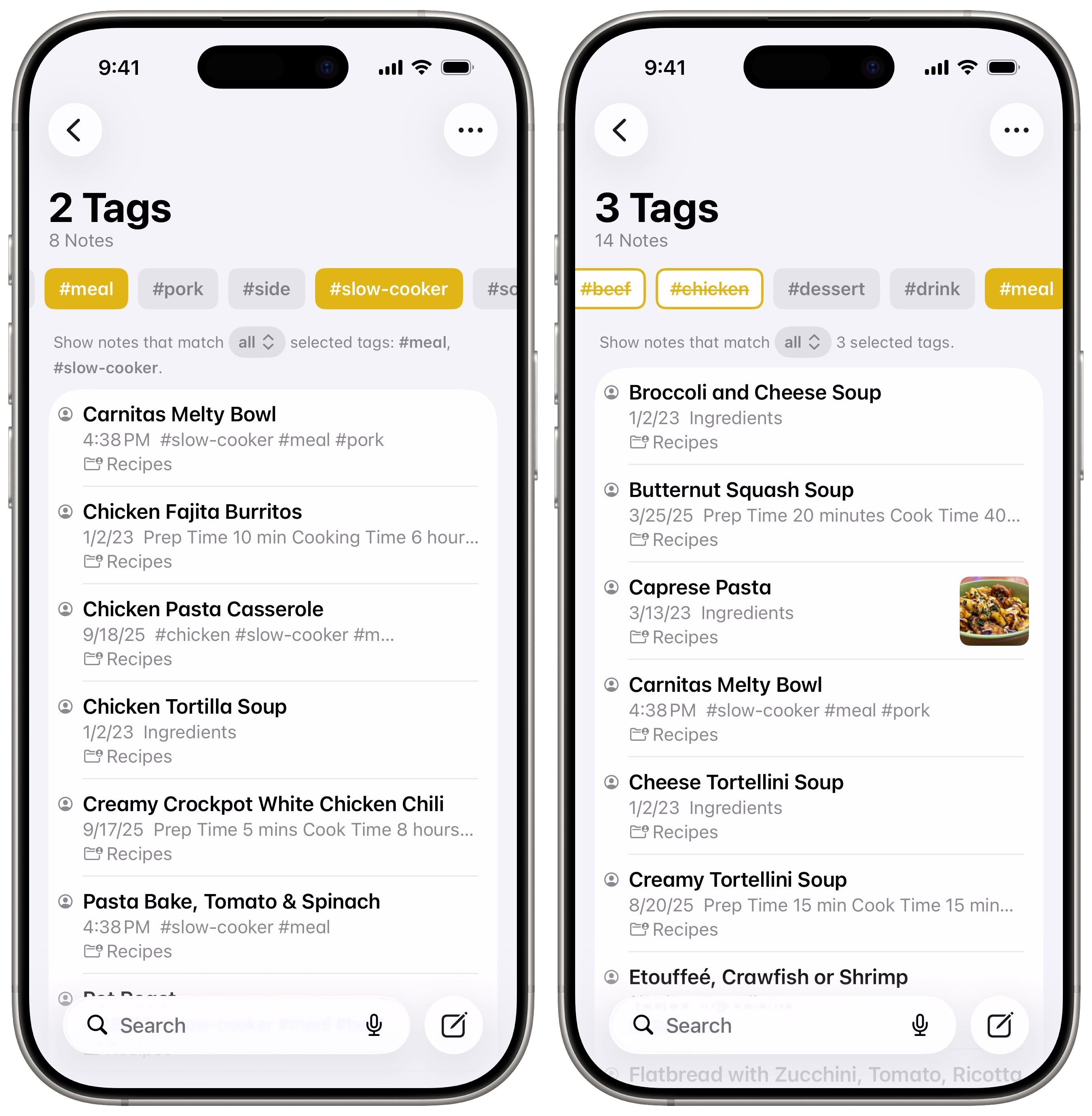 Tap on any tag to filter notes by tag. You can select two or more tags to narrow down your search. Tap on a tag twice to search for notes without that tag, or a third time to clear it.
