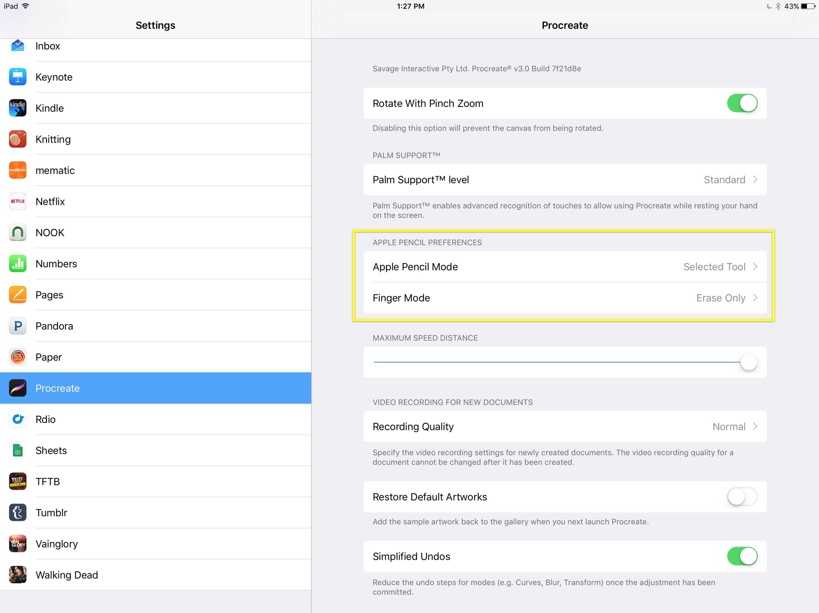 Launch Settings and then swipe down to the section with all the app-specific settings. Tap on Procreate, then look for the Apple Pencil preferences section. Tap on Finger Mode to tell your iPad what to do when you touch the screen with your finger rather than with your Apple Pencil.
