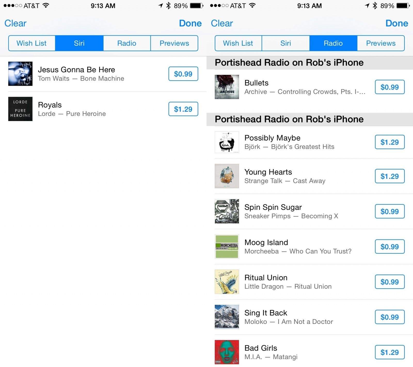If you’re trying to remember what songs were playing for you on iTunes Radio, simply tap on the Radio tab at the top of the same page and you’ll get a list of all the songs played on any of your iCloud-connected devices via iTunes Radio.