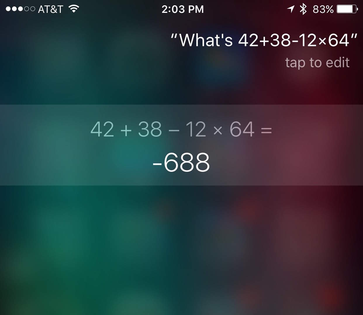 But the answer is WRONG, depending on how you read the equation. I read it as 42+38=, -12=, x64= which totals 4352. If that’s how the equation is expressed, Siri can’t help you.