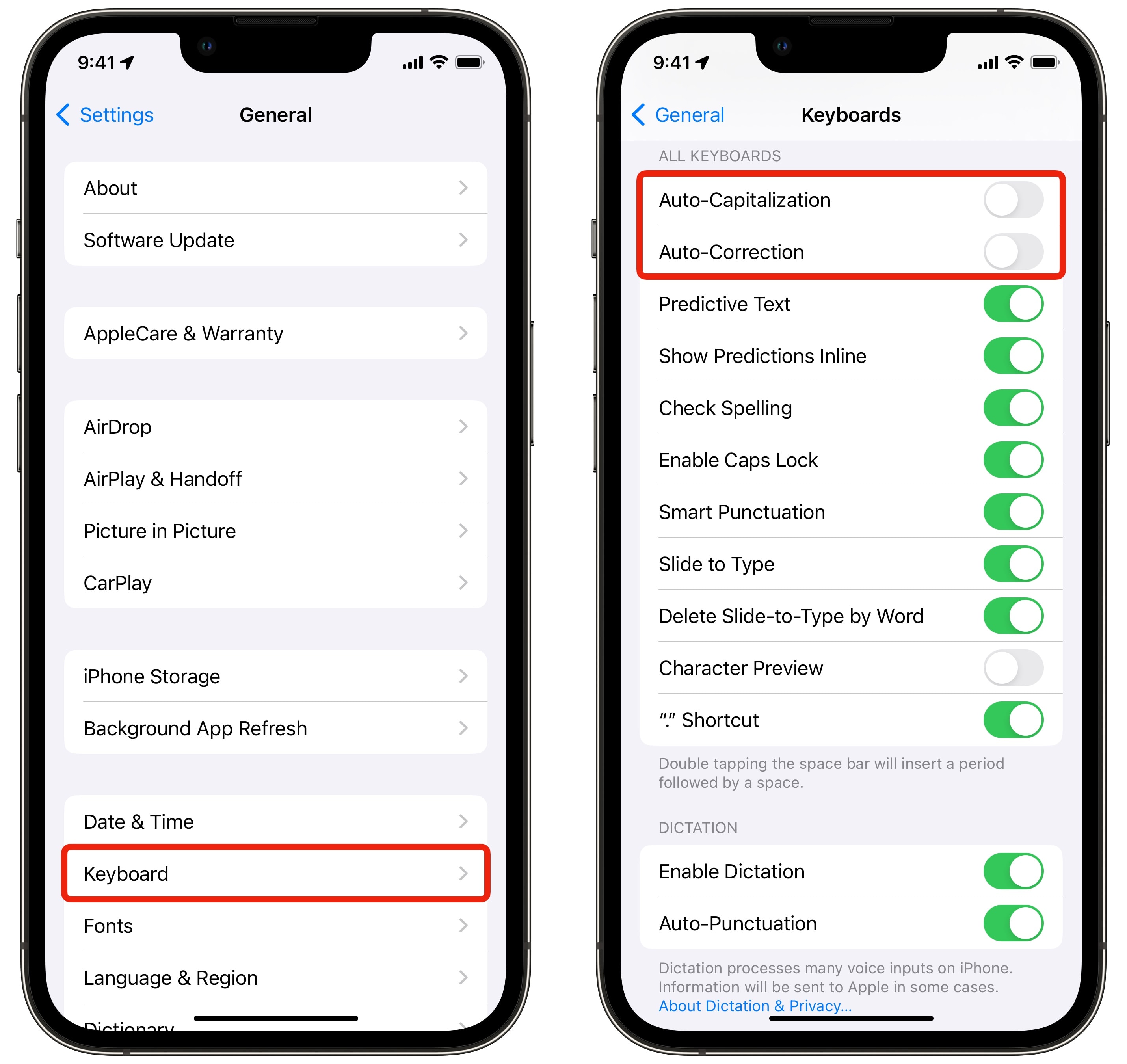 Turn off Enable Dictation if you want to remove the microphone icon below the keyboard for speak-to-type. Similarly, disable Auto-Punctuation if you want to dictate punctuation like commas and periods; you don’t want your phone to intelligently guess how to punctuate.