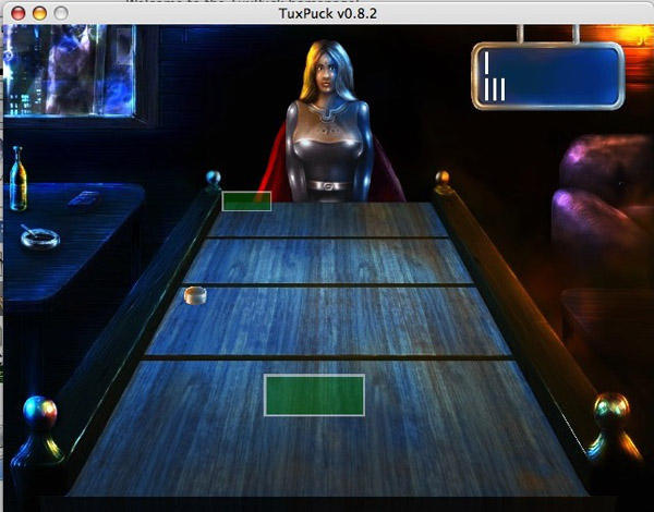 For those of you who remember the good old days of the Error Bomb and the SE-30, you may remember the old Broderbund game Shufflepuck Café. You were thrust into rough and tumble space bar, clearly the outsider, forced to prove yourself in a true game of wits and agility: computer air hockey. It was a simple game for simple times: a handful of wacky alien characters, mild nudity, and an animated screen crack when your opponent scored. Ah to go back for one more round.