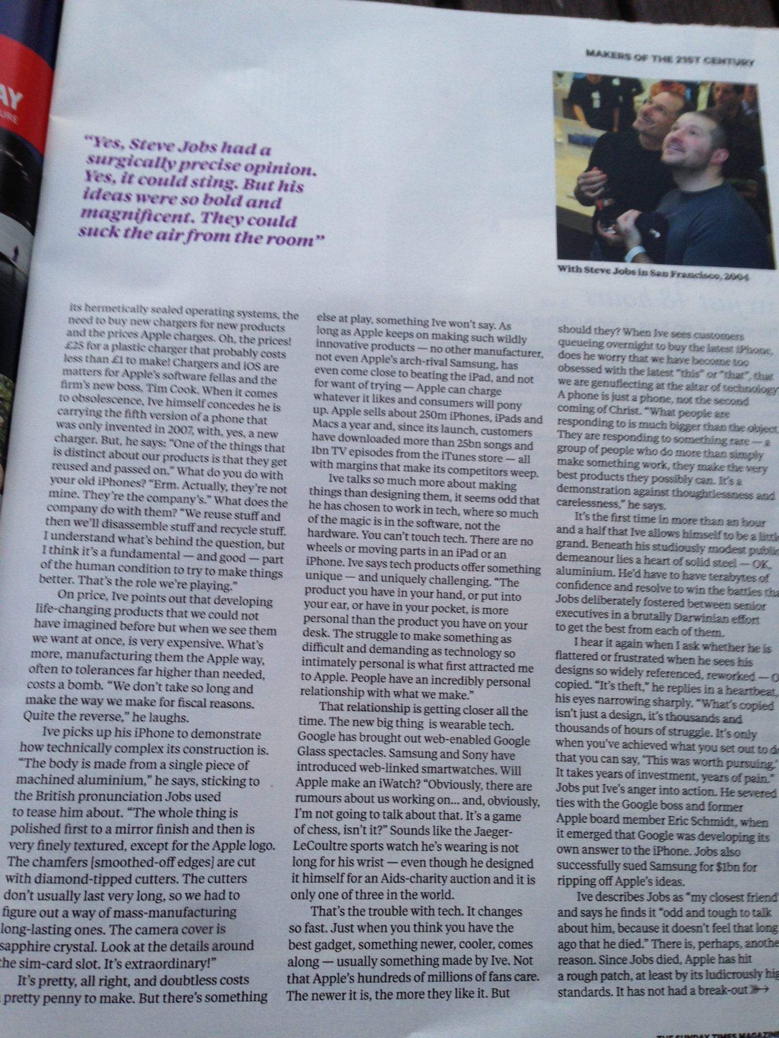 The strangest thing is that Ive recycles the same quotes he’s used in the past. Believe me, I’ve read them all. He says that Steve Jobs’ ideas sometimes sucked the air from the room (previously uttered in his tribute to Jobs) and that he wanted to be a car designer, but other students made weird “vroom vroom” noises while they worked (from an Observer interview). There’s absolutely nothing new in the entire piece including the obligatory hint of an amazing new product, which of course, he can’t talk about.