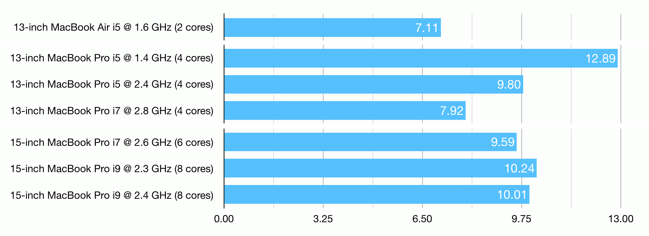 We started with the 13-inch version of this laptop because it offers unusually clear results. The version with a 1.4GHz quad-core i5 processor has a 12.89 GpD, far better than any of the others. With a starting price of $1,299 it’s by far the most affordable, but its Geekbench score is not that much slower than its sister models.