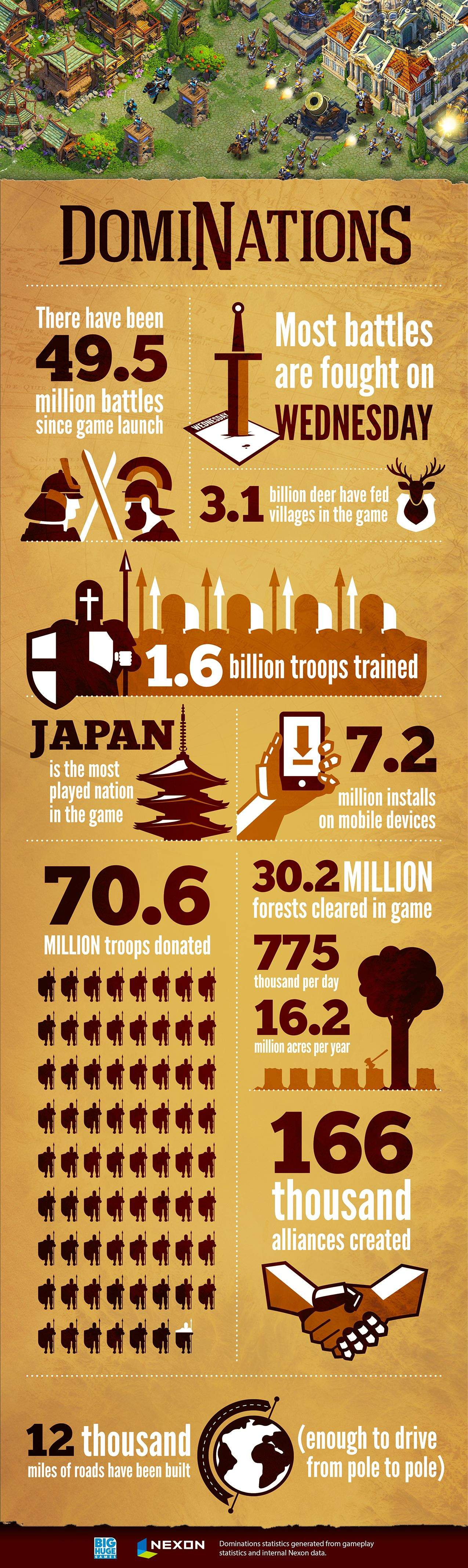 Players have trained over 1.6 billion soldiers to fight in 50 million battles, engaging in 166,000 multiplayer alliances to do so. 70.6 million troops have been donated to other players to take down enemy alliances, and it seems like most of the hot action happens on Wednesdays.