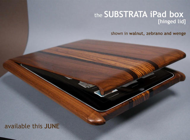 Coming in flavors of dead tree flesh including walnut, zebrano, wenge, mahogany and maple, and shipping with both hinged and sliding lids, the Substrata iPad cases (replete with microsuede lining to prevent scratches) should be available in June for an unknown but probably fairly expensive price.