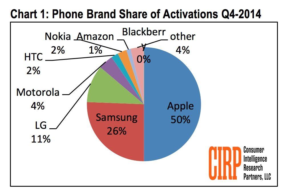 Apple enjoyed historic sales this holiday season, and while the company won’t reveal its official earnings until January 27th, based on the latest smartphone activation report from Consumer Intelligence Research Partners, Apple dominated the holiday shopping season and accounted for 50% of all smartphone activations in Q4 2014.