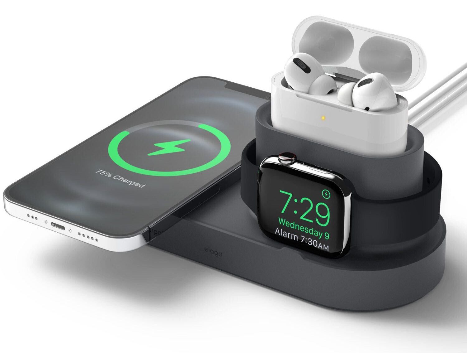It’s similar to the Duo Watch hub, but it allows you to charge three devices at once. It’s compatible with iPhone 12 (all series), AirPods Pro and Apple Watch.