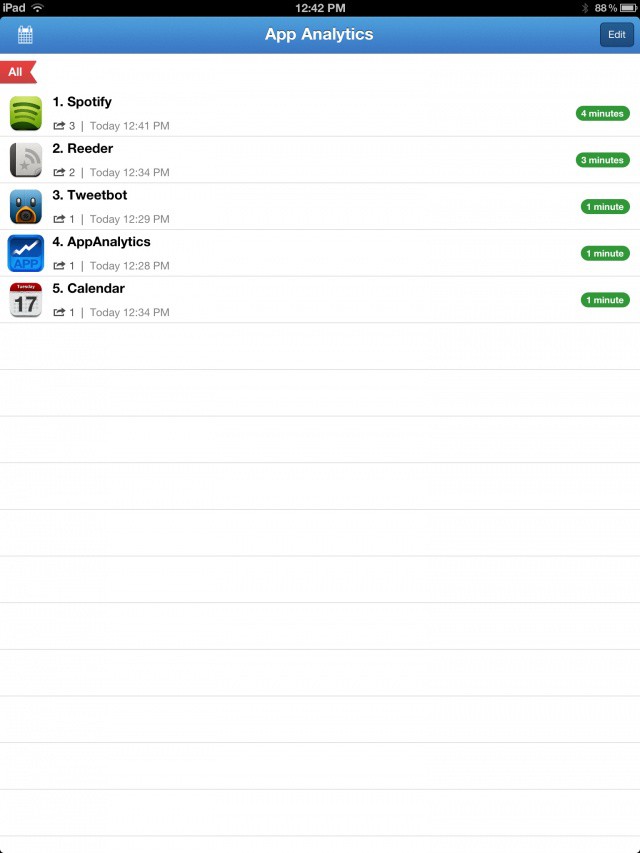 Opening the app greets you with a list of the iOS apps you use in descending order of how much you’ve used them. You can see the number of minutes you’ve spent in each app since App Analytics was installed, and tapping each app icon instantly opens said app.