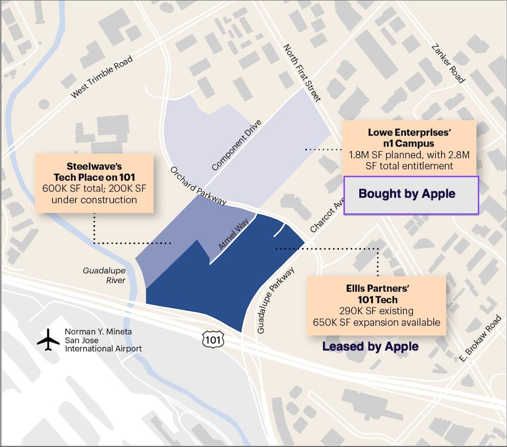 The 300,000 square foot building from Ellis Partners that Apple is already leasing is practically next door to the site the company just purchased. The undeveloped land could is approved for up to 2.8 million square feet of office space, which is about the same size as the spaceship campus under construction in Cupertino.