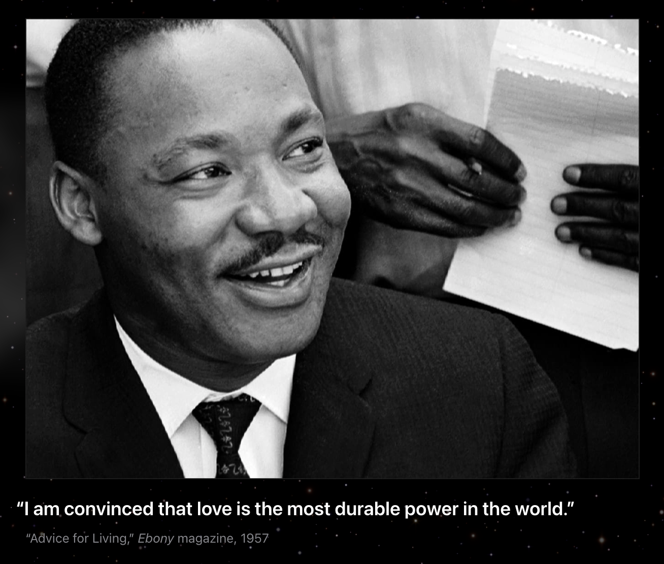 “We honor Dr. King and reflect upon his life and legacy,” Apple said in print alongside a pixellated, constellation-like image of a smiling MLK against a black background filled with stars.