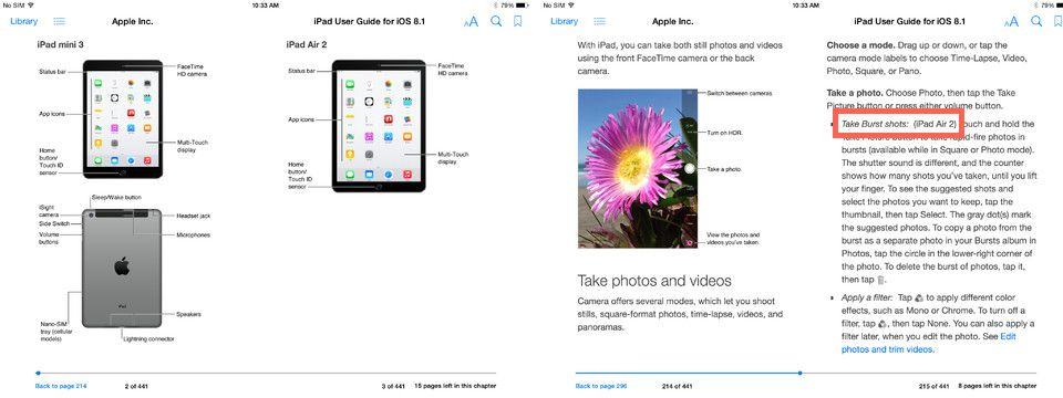 Apple updated its iOS 8 user guide this morning with photos for the new ‘iPad Air 2’ and ‘iPad mini 3.’ The actual iBook contains no information about the new devices, but preview images for the iPad User Guide For iOS 8 on contains references to the addition of Touch ID and a Burst Mode for the Camera.
