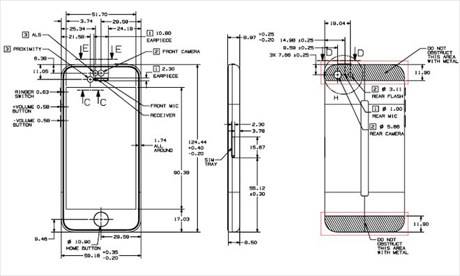 The iPhone 5c drawings similarly spell out some interesting details about the new handset. For example, the schematic shows off a new steel-inforced frame doubling as a multi-band antenna.