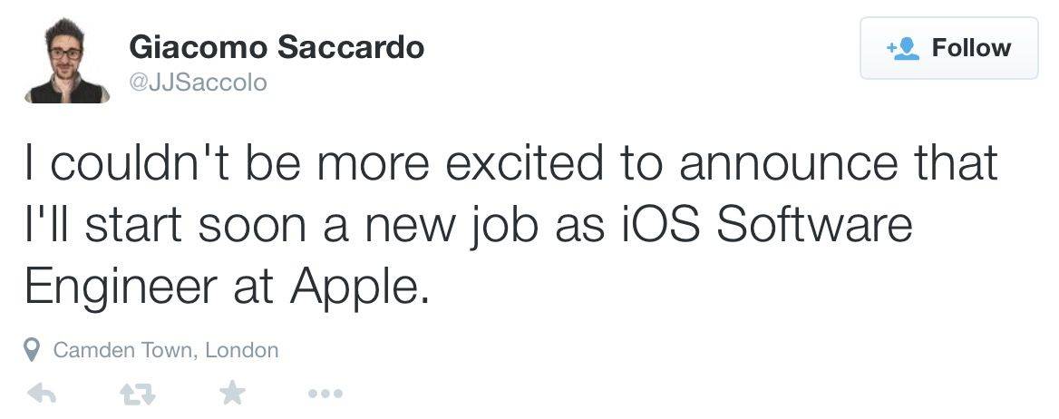 One of those developers, Giacomo Saccardo, said on Twitter today that he now works for Apple, but the tweet has since been deleted.