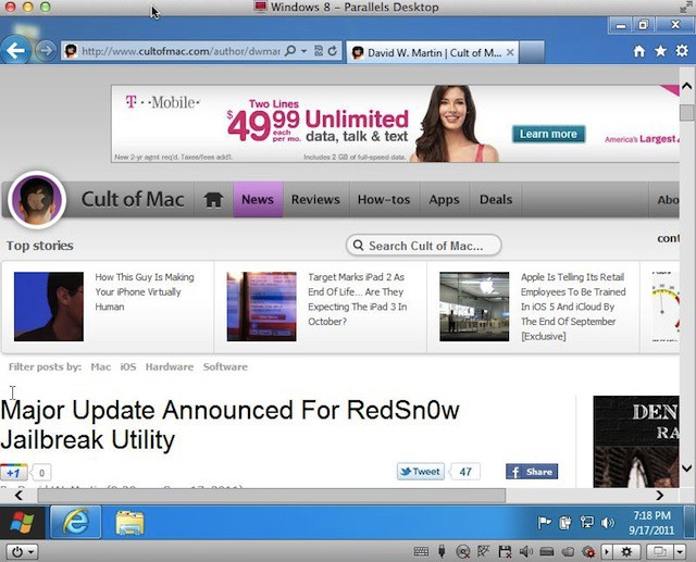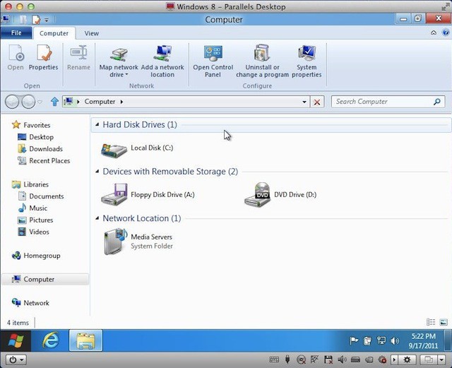If you’d like to install Windows 8 into a Parallels Desktop 7 virtual machine and do a little exploring on your own you’ll need to go download the Windows 8 preview. Afterwards use the ISO image to install Windows 8 in Parallels. The installation is pretty straight forward if you are familiar with the steps used to create a Parallels virtual machine with one warning. Don’t use the express install feature of Parallels instead complete the installation manually. If you still need help figuring this out check out the message boards on forum.parallels.com.