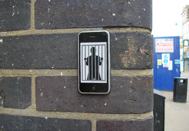 This kind of street art (it takes a hipster to catch the attention of one?) may be more arresting to iPhone users than a traditional standing-around-with-posters protest, like the kind held outside San Francisco’s Apple store last month over the same labor issue.