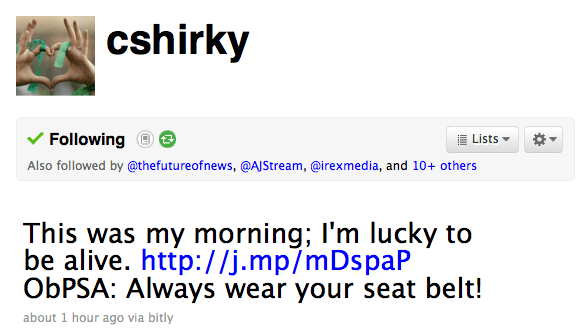When best-selling tech author Clay Shirky tweets “lucky to be alive. Always wear your seat belt!” he gets our attention.