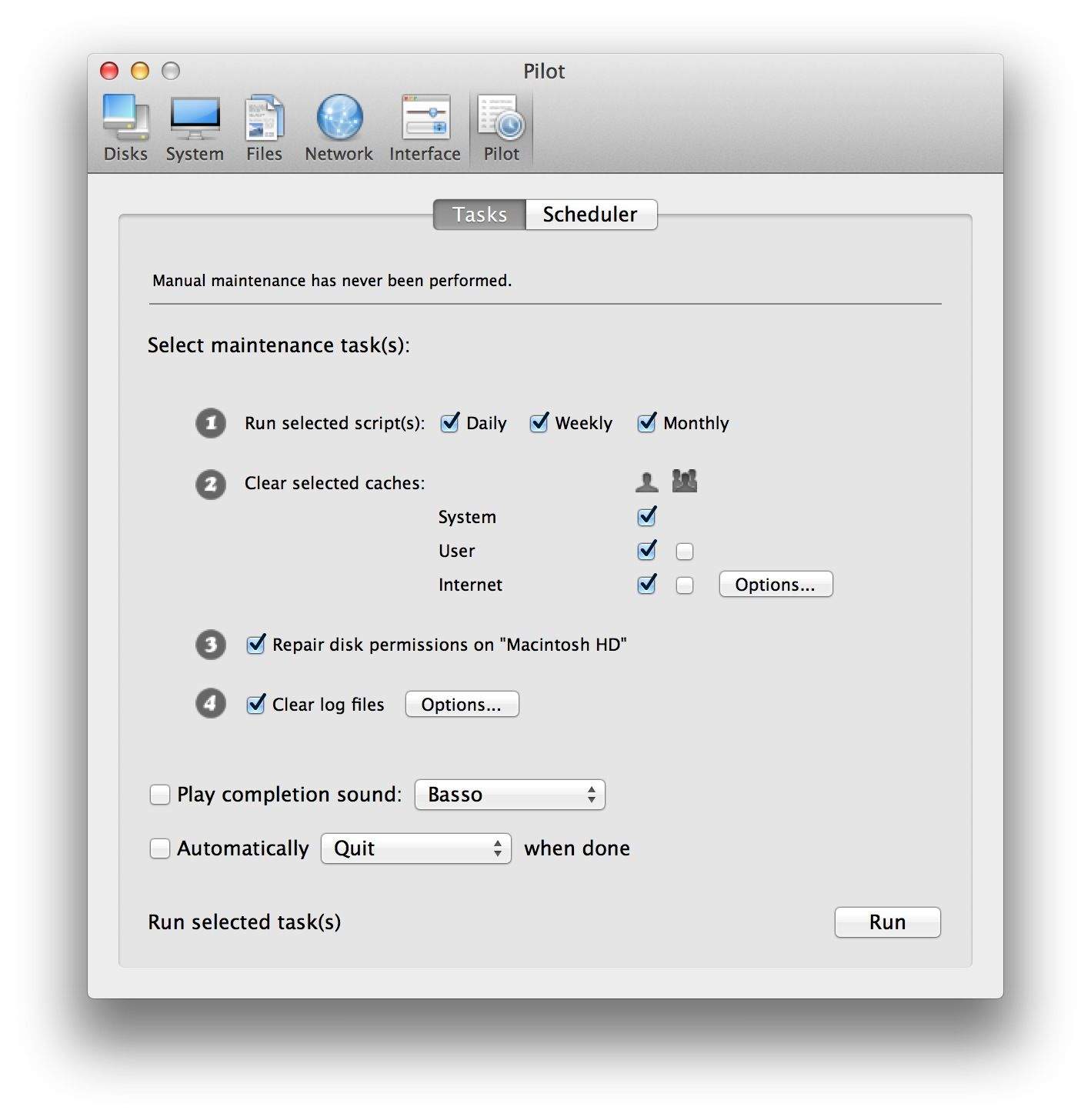 The app has been tweaked and improved to be as smooth as butter and offer more fine-tuned settings. You can do things like repair and reset disk permissions, purge inactive memory to save space, disable Notification Center, clear all of your caches, delete locked files, modify hidden OS X settings, and more. Pilot is a great new mode that does cleaning up for you with just one click.