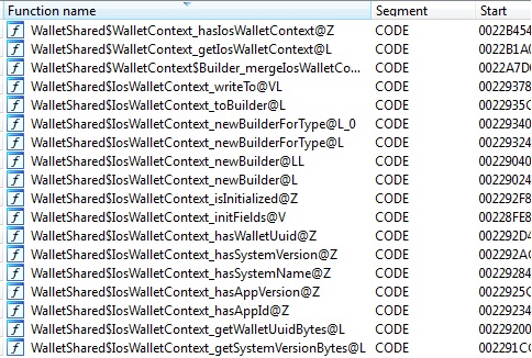 The first hints came within the “WalletShared” protocol buffers package which contained “IOS” values within the defining “DeviceContext -> HardwareType” field (you can see those in the image above). Later they found other hints within two additional protocol buffers called “IosDevice” and “IosWallet.” While the details were scarce, they call for information such as “appId”, “appVersion”, “walletUuid”, and a few “model” and “version” items.