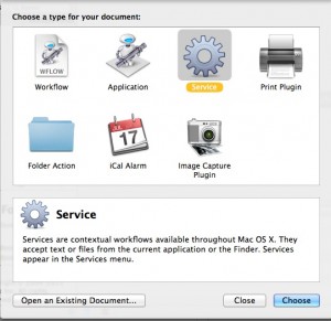 To create your own Service, open Automator from the Applications folder; it’s a Mac app that comes with every copy of OS X. Once launched, choose Service (the icon looks like a big gear), and then click the Choose button. Then, click on Utilities in the left hand pane, then Run Applescript in the pane to the right. You can also type Applescript into the search field at the top left of the window to find the “Run Applescript” service creator. Drag the Run Applescript icon to the pane on the right, and it will create a blank template for you. Then, type or paste the following script in, completely replacing the template text: