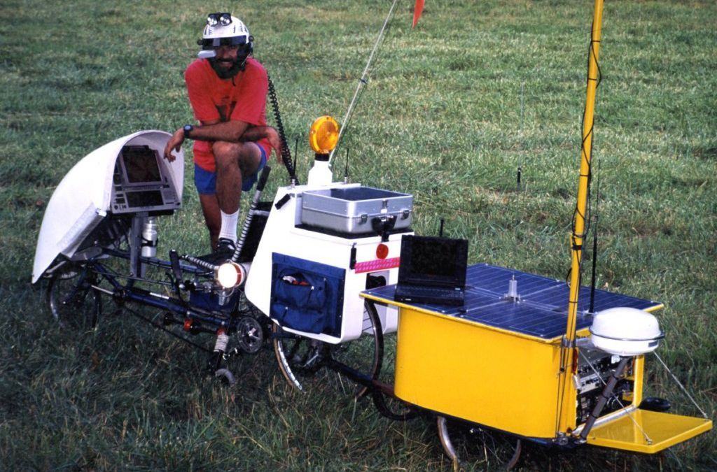 The creation of a self-taught computer hobbyist named Steve Roberts and about 45 other engineers, machinists, and bike enthusiasts at Mountain View’s BikeLab, the Behemoth weighed 580 pounds, and contained three laptops — including a Mac — networked together, as well as a color LCD display, a satellite earth station, a CD player, a handlebar keyboard, and solar panels.