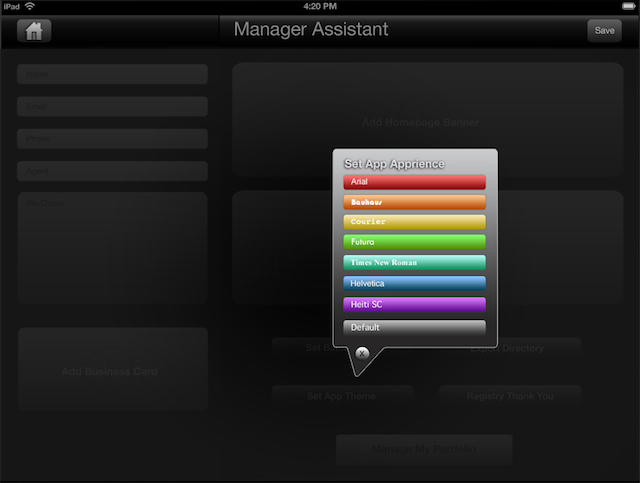 Then, from within the app, custom splash page, headers, and business cards, as well as background colors and font styles can be customized to fit the personality of the work to be displayed.