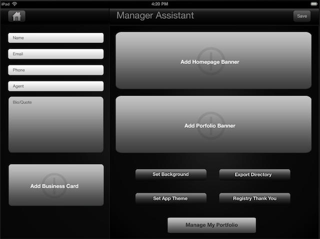 Well, what if that artist or designer could pour all of his or her work into Apple’s sleek 10″ iPad, pop it on some decision maker’s desk and with the touch of a button wow “the Man” with a branded slideshow, complete with a customizable business card, presentation environment and guest book for the artist to collect contact information in?