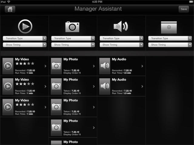 Once content is loaded it can be arranged and repositioned to fit whatever display preferences the user chooses, be it still images viewed by swipe or by slideshow with customized transitions and intervals. The app supports video and audio content as well, and links to websites can be opened within the app without having to access Safari or another web browser on the iPad.