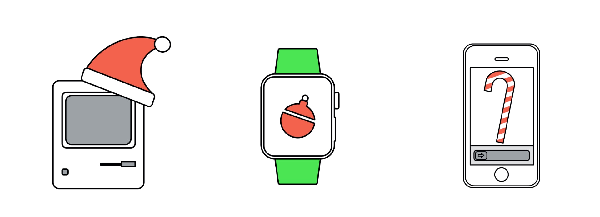 We’ve created three simple decorations inspired by iPhone, Apple Watch, and the original Macintosh — all with a holiday twist. They’re bright but printer-friendly, and easy to cut out.