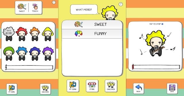 When you first install the app you have by default sound a piano synth that works by tapping on cute little Dr. Smith icons representing do re mi fa sol la si. Alternatively, you can hum or sing and the app records your voice. Finally, if you don’t feel like doing any real composing per se, you can shake your iPhone and your very vibes will create music for you!