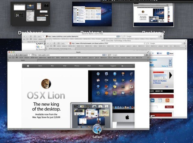 In this example I’m dragging Safari and three of its open windows from Desktop 2 to Desktop 1 where my Twitter application and iCal presently live.