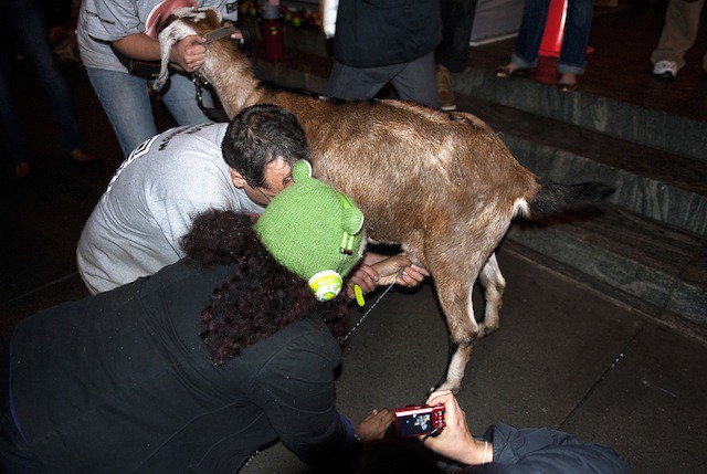 The animals are parked across the street from Apple’s store in front of the Plaza Hotel. Horowitz is giving out the fresh milk and running a mini petting zoo. Bystanders are invited to milk the animals.