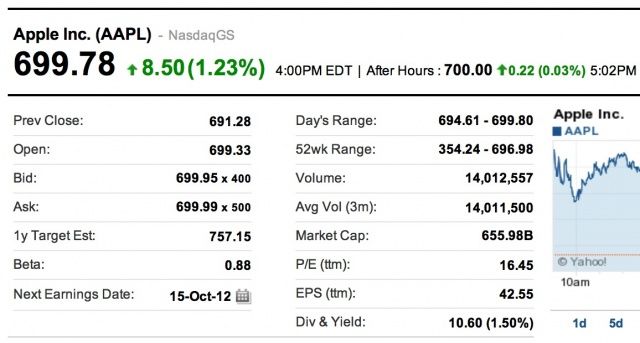 Apple stock has been climbing rapidly towards $700 per share since the iPhone 5 was announced Wednesday, September 12th. Now, less than a week after the announcement from Apple, AAPL has hit $700 in after hours trading, marking an all-time high.
