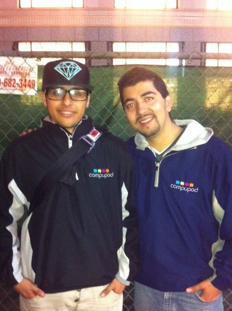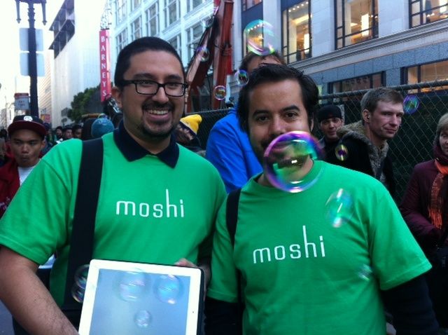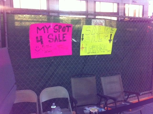 Hugo Gonzalez and Christian Soto are second in line promoting their business, Compupod. They fix iPhones and other iDevices for a living. A cracked screen will cost $50-$99 depending on the model. They have been in line since Wednesday and brought their own tent.