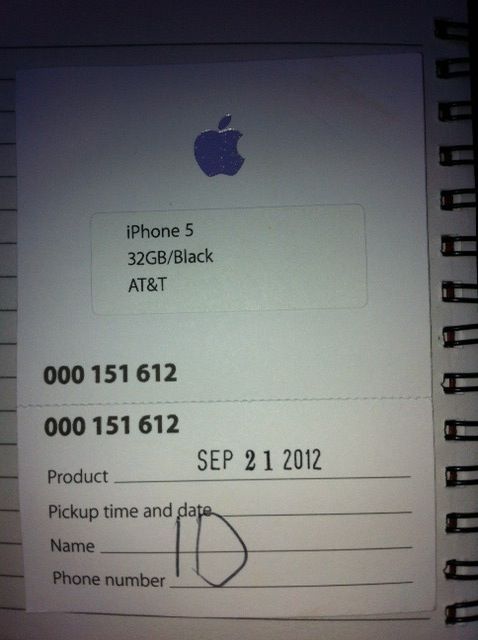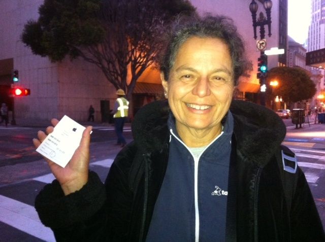 This is Rose Marie, an official TaskRabbit line holder. She’s holding up a reservation ticket just given to her by an Apple Store retail employee. Rose Marie has been waiting in line since 3am. She has ticket #10 for iPhone 5.