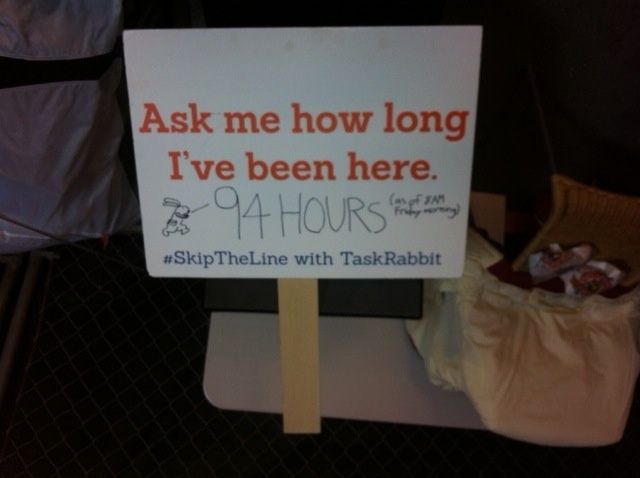 In fact, there are about 70 “TaskRabbits” in line here in San Francisco, who are being paid $55 to wait up to four hours for other people. A TaskRabbit rep estimated that one in four in line here are TaskRabbits.