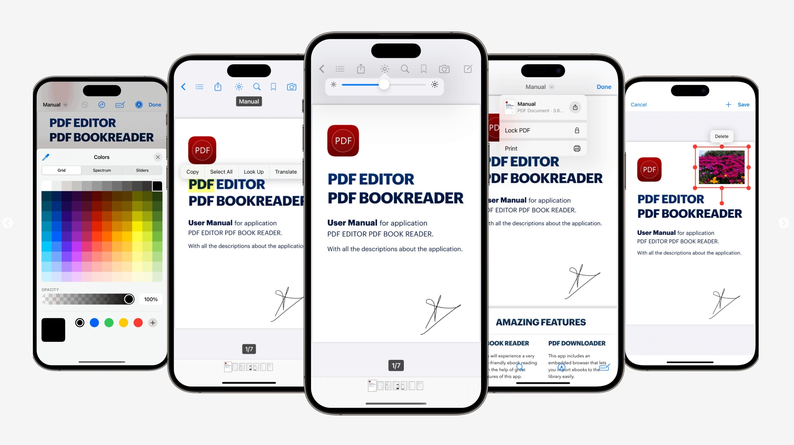 PDF editor. Add Text Boxes anywhere you want in the file and and edit them however you like. You can also draw shapes with different colors, easily insert signatures and images. The app includes professional color palettes and a lot more.
