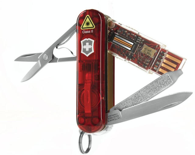 The Flash 2GB Swiss Army Knife puts a new spin on the standard knife by Victorinox. It still has the original tools like the blade and screwdriver, but also includes a removable USB flash drive. The Gadget Geek will also appreciate the retractable ball point pen and a LED mini white light.
