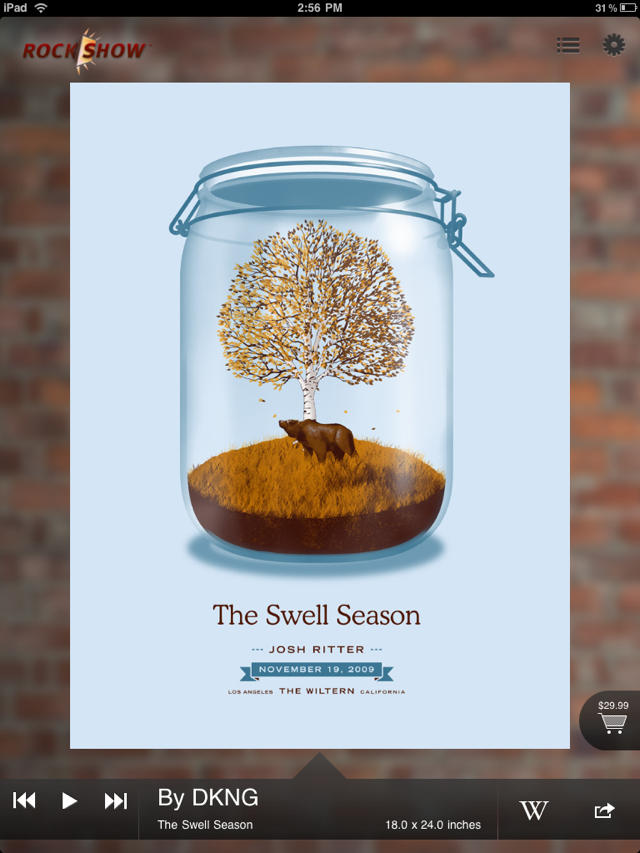 Rock Show leverages the iPad’s screen real estate to deliver high resolution views of limited edition fine art print concert posters from artists and designers such as Darren Grealish (The Killers, Stevie Wonder, Brian Jonestown Massacre and Lee Scratch Perry) and Lil Tuffy (Dead Weather, Sonic Youth), which makes it a nice vehicle for showing off the iPad’s graphics chops.