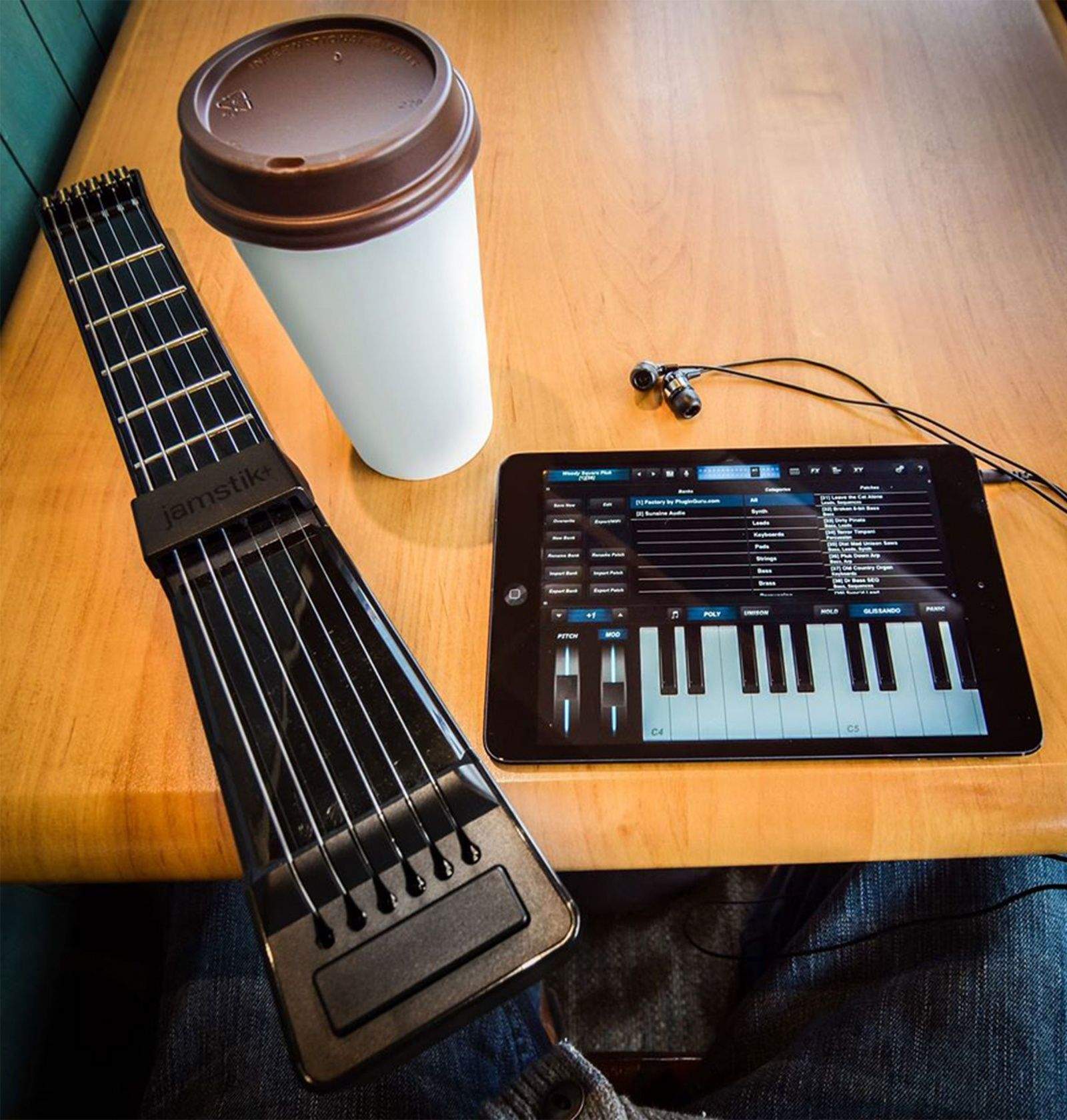Jamstik is small practice guitar with five frets and strings that never need tuning. It weighs under two pounds and has a patented sensing method to determine finger position on the fretboard. It’s powered by a rechargeable lithium battery..