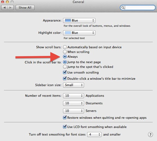 Locate the section Show scroll bars and change the setting to Always. Now your scroll bars will always be visible like they were in Mac OS X Snow Leopard.