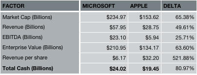Remember the house joke is that Microsoft is the Borg, they’re ginormous, yet on most KPI’s Apple is a better than half the size of Microsoft. The Borg’s sky-high EBITDA is understandable; they’re a software company, and margins on software are higher than on consumer products. But what is really shocking is looking at cash on hand; Apple and MS are virtually on par with each other here.