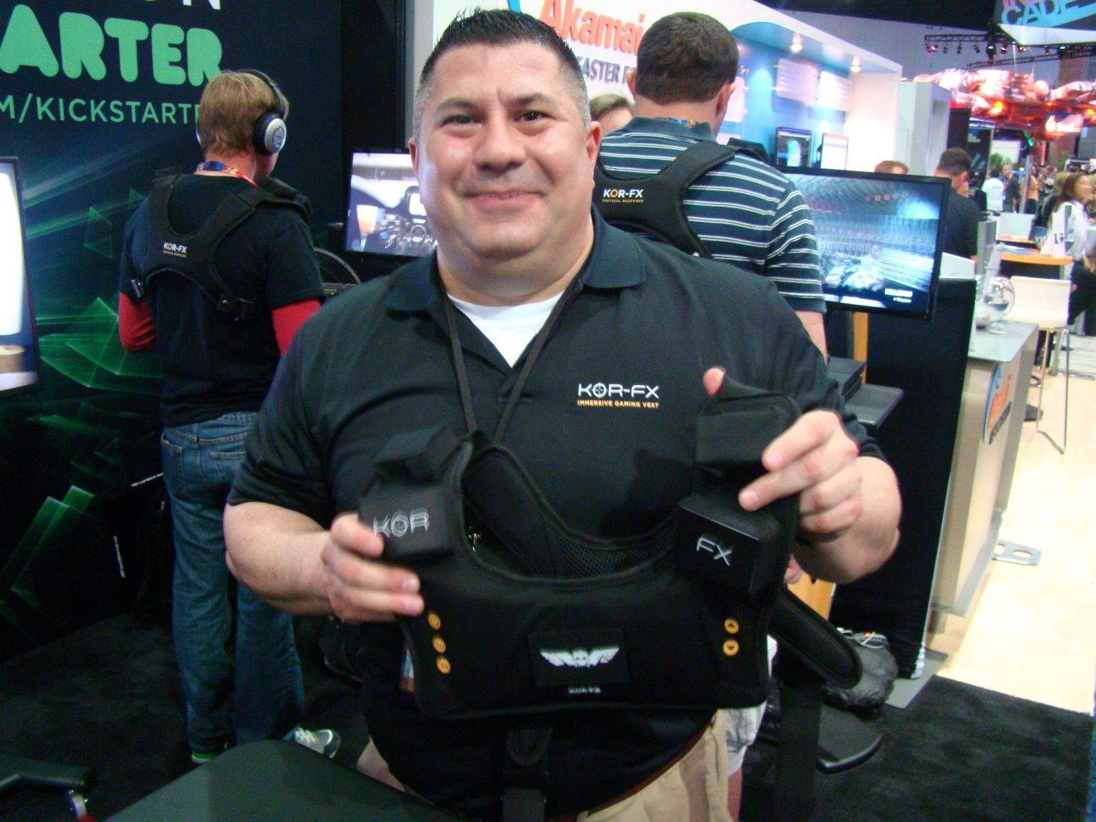 Strapping on the vest over my chest with velcro closures, Fandetti (pictured below) told me that the vest is currently on Kickstarter, and they’re looking to bring it to the retail market soon for gamers who want to immerse themselves into their games. He’s excited about this, since this is the first time in a five-year development cycle that a production-level unit has been available to people to try out.